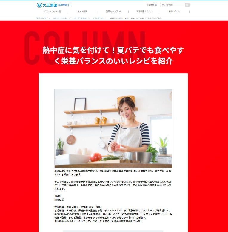 薬機法にも強い管理栄養士 横川仁美( @starshiplovely )です。大正製薬さまのスポーツコラムで「熱中症に気を付けて!夏バテでも食べやすく栄養バランスのいいレシピを紹介」。この時期の過ごし方で気をつけるポイントや夏バテ対策レシピを記載していますよ^^