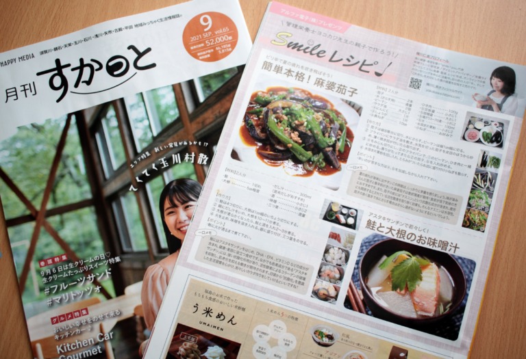 地域みっちゃく生活情報誌『すかっと』9月号にアルファ電子(株)様の「う米めん」とともに『簡単!本格麻婆茄子』 と『鮭と大根のお味噌汁』を掲載中です。
