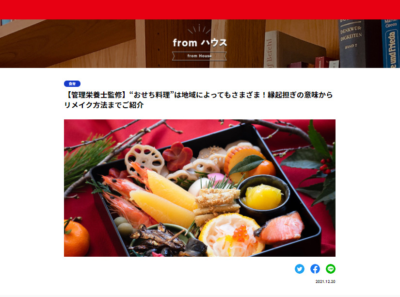 今回もハウス食品グループ株式会社様のWeb会員サイト「ComeOnHouse」における「fromハウス」で掲載!「【管理栄養士監修】“おせち料理”は地域によってもさまざま!縁起担ぎの意味からリメイク方法までご紹介」を執筆させていただきました。