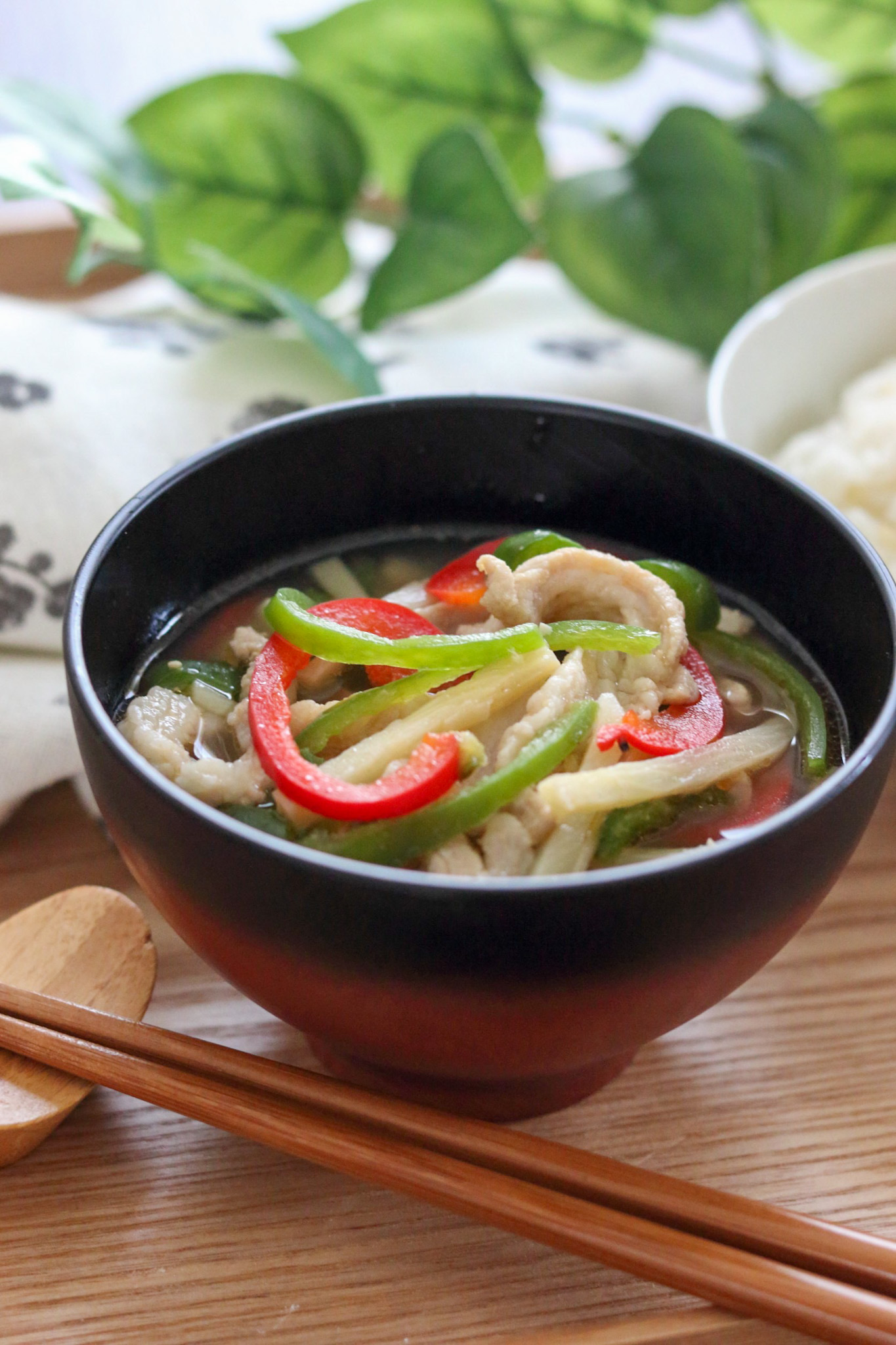 今日の健康・キレイ♪具だくさんお味噌汁・スープのご紹介は、「青椒肉絲(チンジャオロース)風味のお味噌汁」です。青椒肉絲の具材や調味料を使って、お味噌汁を青椒肉絲風にアレンジ。具材が少なくメインとしては物足りないときや、副菜を美味しくしたいときにぴったりです