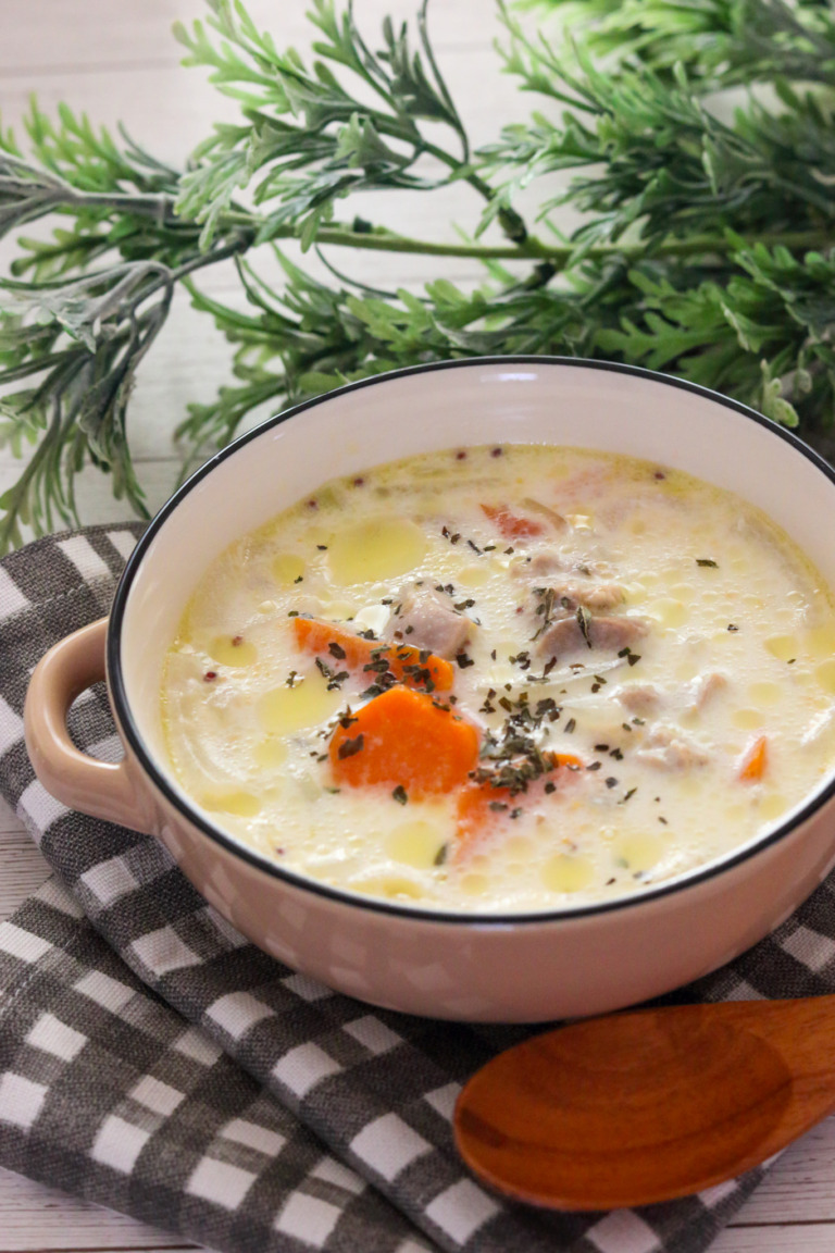 今日の具だくさんお味噌汁・スープのご紹介は、「鶏肉と野菜のマスタード入りミルクスープ」です。