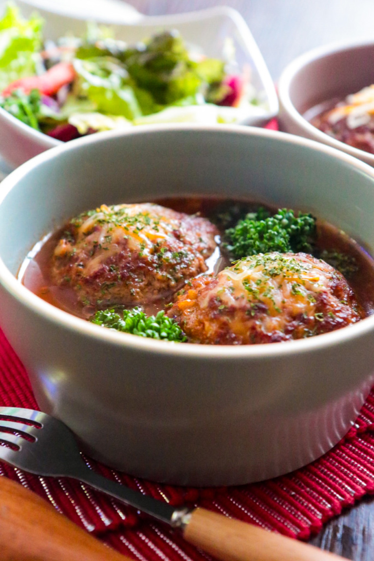 デミグラス風スープにハンバーグを加えた、食べ応えのある一品。おしゃれな器に盛り付けると、自宅でカフェのような雰囲気が楽しめます。