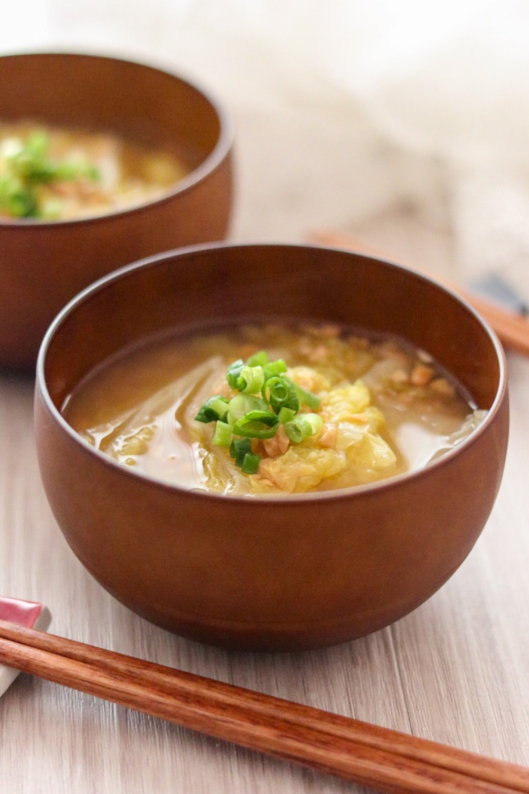 今日の具だくさんお味噌汁・スープのご紹介は、「白菜と納豆のお味噌汁」です。