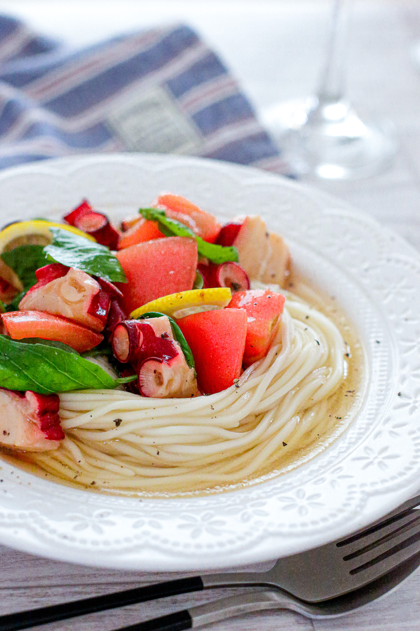 トマトやたこをレモン香るマリネにして、ゆでてしめた細うどんにのせるだけ。