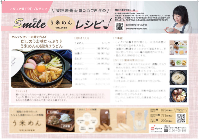 地域みっちゃく生活情報誌『すかっと』9月号に、アルファ電子(株)様の「う米めん」を使った『だしのうまみたっぷり♪う米めんの鍋焼きうどん」』レシピを掲載しています。