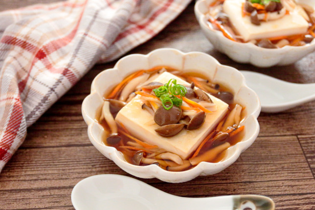 植物性たんぱく質を手軽に補える豆腐に、きのこを組み合わせたレシピです。きのこのうま味を活かすことで、素材の味わいを楽しめる一品に仕上げました。