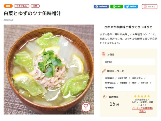 【レシピ】白菜とゆずのツナ缶味噌汁(カマエイド様)